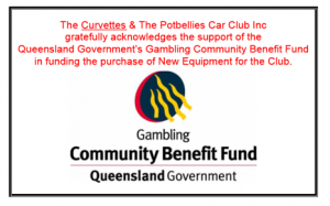 The Curvettes & The Potbellies Car Club Inc gratefully acknowledges the support of the Queensland Government’s Gambling Community Benefit Fund in funding the purchase of NEW Equipment for the Club.